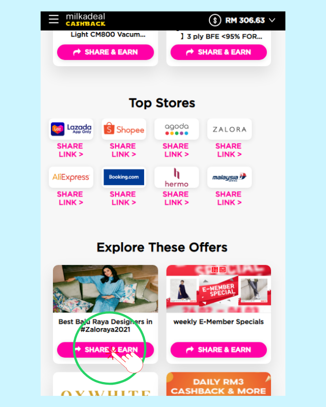 2. Scroll down and click Share Link on any Top Stores or Share & Earn on any Offers.