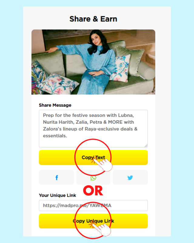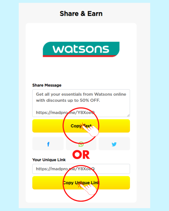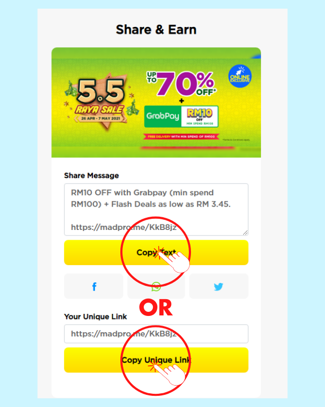 4. Copy Text or Unique Link. (Note: If you wish to change your share message here, you can do so! Just make sure the link stays the same.)